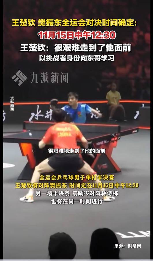 据北青体育消息:全运会乒乓球男子单打半决赛,王楚钦将对阵樊振东,时间定在11月15日中午12:30。另一场半决赛,袁励岑将对阵林诗栋,也将在同一时间进行。