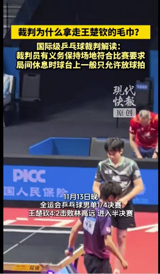 本场比赛,一个细节被不少网友讨论:在一次局间休息时,王楚钦拿了两条毛巾,一条擦汗,另一条放在球台上,垫在乒乓球拍下。在王楚钦与教练商量战术时,当值裁判看到这一幕后,拿走了垫在球拍下的毛巾。很多网友表示不解——“为什么要拿走他的毛巾?”“不应该随意动运动员球拍”。